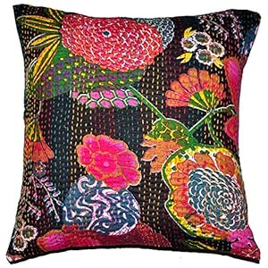 Indian Black Embroidered Handmade Decorative Kantha Pillow -Home Decor Boho Pillow Shame Indian Cotton Cushion Cover Kantha Floral
