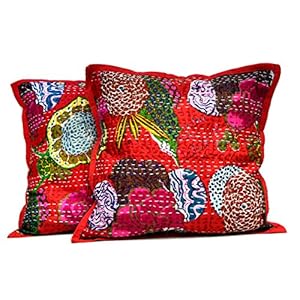 Krishna Mart India 2 Red Home Décor Pillowcase Traditional Kantha Stitch Floral Throw Pillow Cushion Covers